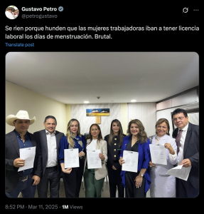 “Se rien porque hunden que las mujeres trabajadoras iban a tener licencia laboral los días de menstruación. Brutal”, publicó el presidente, adjuntando una fotografía de los ocho congresistas que se opusieron al proyecto de ley. Seguro supuso que era la forma y el momento indicado para hacer las veces de empático, dejando de lado la tensión y llamándonos nuevamente a las mujeres para que levantemos su bandera y participemos en la consulta popular.